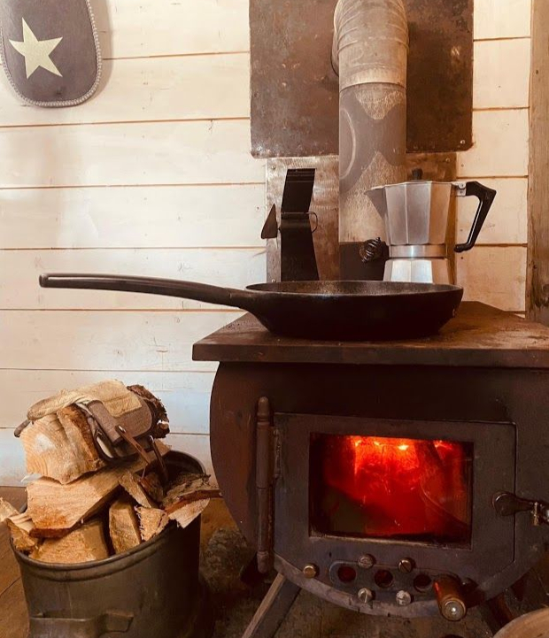Le poêle fournit l'eau chaude et on se débarbouille à l'ancienne. Le cabanon toilettes-sèches est installé à proximité.